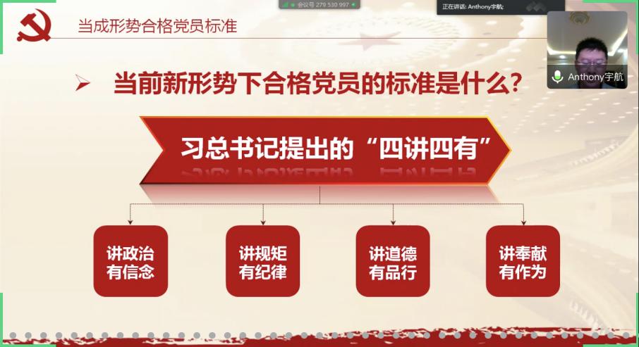 王乙行老师的党课名为学党章 知党情 做合格党员》王老师认为,党章是一名共产党员必须学会学懂学通的内容,掌握如何成为一名合格的党员则更是必要条件。王老师从学党章学什么、知党情的现实意义以及做合格党员,永远跟党走三个层面讲解了这堂党课。他首先介绍了党章的组成及每一部分的大致内容,他强调一定要熟读党章,基本的内容熟记心中,时刻用党章提醒自己,并和同学们互动普及了党员的纪律处分问题;随后王老师介绍了党情的概念并强调,知党情有非常重大的现实意义,党始终具有先进性,是一直与时俱进的,如果我们不能及时学习,就不能得到进步。学习党情有利于我们价值观的树立,有利于寻找党的政治新途径,了解党情、国情和社会的基本情况是一个大学生的基本素养。王老师还指出疫情当下,我们更应该起模范带头作用,监督自我的行为。最后,王老师提出了做合格党员的四点要求:做到讲政治有信念,用马克思主义武装自己;讲规矩有纪律,时刻端正自己的言行举止,用纪律约束自己;讲道德有品行,努力提升道德水平;讲奉献有作为,从点滴的小事做起。