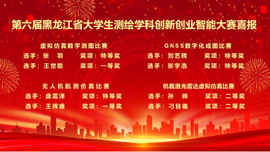5月16日至17日,由黑龙江省教育厅与黑龙江省测绘地理信息局联合主办的“南方测绘杯”第六届黑龙江省大学生测绘学科创新创业智能大赛在黑龙江科技大学隆重举行。来自全省 35 所高校的测绘学科精英学子同场竞技,我校测量代表队凭借扎实的专业素养与出色发挥,在激烈角逐中脱颖而出,一举斩获团体特等奖,用实力书写了测绘学科人才培养的新辉煌!参赛的八名同学均取得优异成绩。